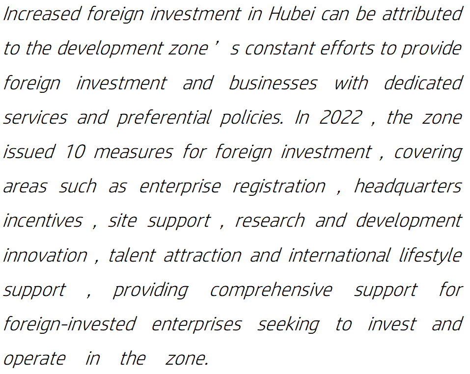 武汉经开区不断优化营商环境,出台优惠政策,为外商投资和外资企业高质量发展保驾护航。2022年,武汉经开区发布了“外资十条”举措,涵盖企业注册、总部激励、场地支持、研发创新、人才吸引和国际生活方式支持等领域,为寻求在武汉经开区投资和运营的外资企业提供全面支持。