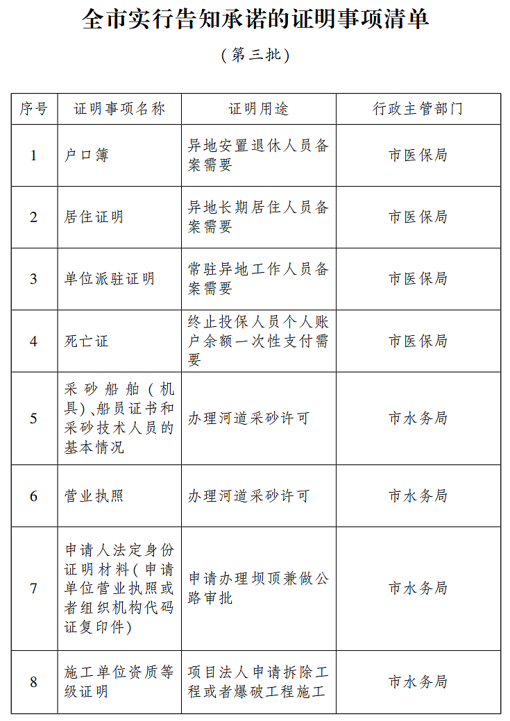 为深入推进简政放权、放管结合、优化服务改革工作,进一步优化营商环境,根据《省人民政府办公厅关于印发湖北省全面推行证明事项告知承诺制工作实施方案的通知》(鄂政办发〔2021〕8号)和《市人民政府关于印发武汉市全面推行证明事项和涉企经营许可事项告知承诺制工作规程(试行)的通知》(武政〔2021〕8号)要求,经市人民政府同意,现将我市实行告知承诺的证明事项和涉企经营许可事项清单(第三批)予以公布。