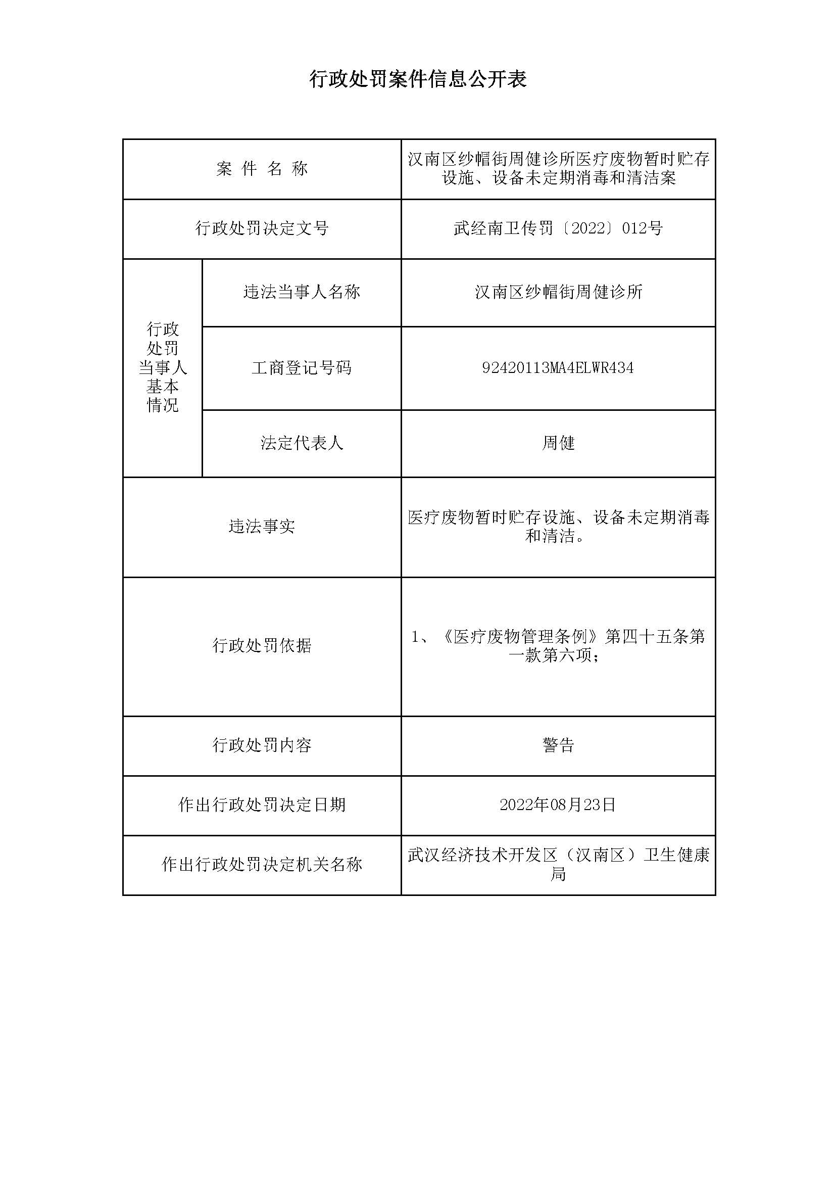 行政处罚案件信息公开表(汉南区纱帽街周健诊所)