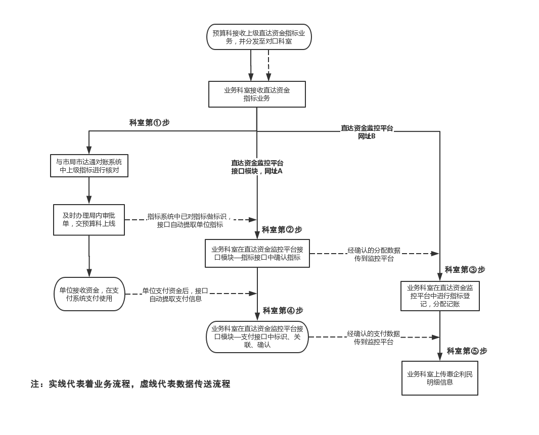 (一)预算分配下达。严格按照直达资金预算管理工作要求,收到直达资金指标文件和系统数据后,及时在预算指标系统中录入预算指标,并添加直达资金标识,分配到具体用款单位,同时将预算指标分配信息导入监控系统,完成预算指标系统和监控系统的对接。对于此前已下达的直达资金,按照上级发文调整直达资金项目和金额的要求,相应调整和修改预算指标系统中的金额和标识,及时将数据导入监控系统。