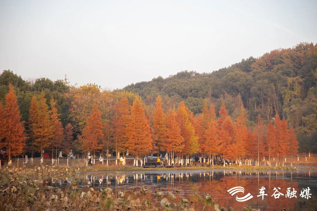 「三角湖公园」内,杉树橙黄,梧桐深红,美拉德色系的秋冬氛围感立刻拉满。