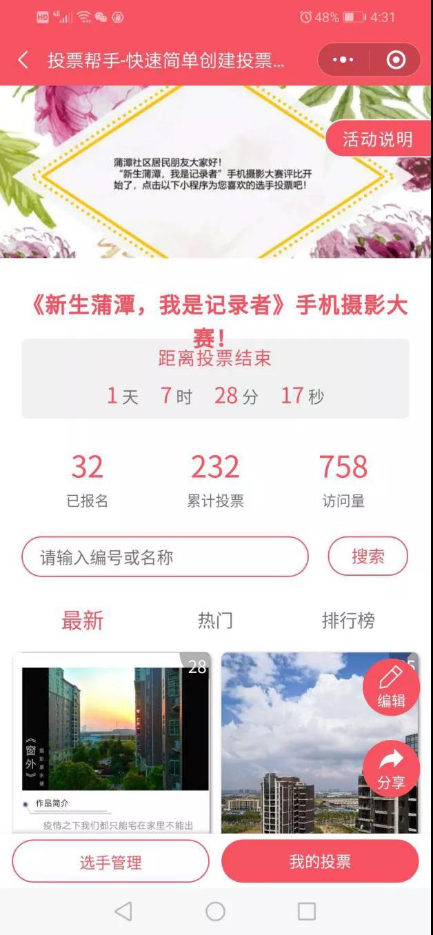 为了丰富宅家期间社区居民的文化生活、提高社区居民的审美能力和创作能力,营造积极乐观、文明向上的社区氛围,蒲潭社区居委会于413-416日开展了宅家抗疫情活动第三弹--“新生蒲潭,我是记录者”手机摄影大赛活动。