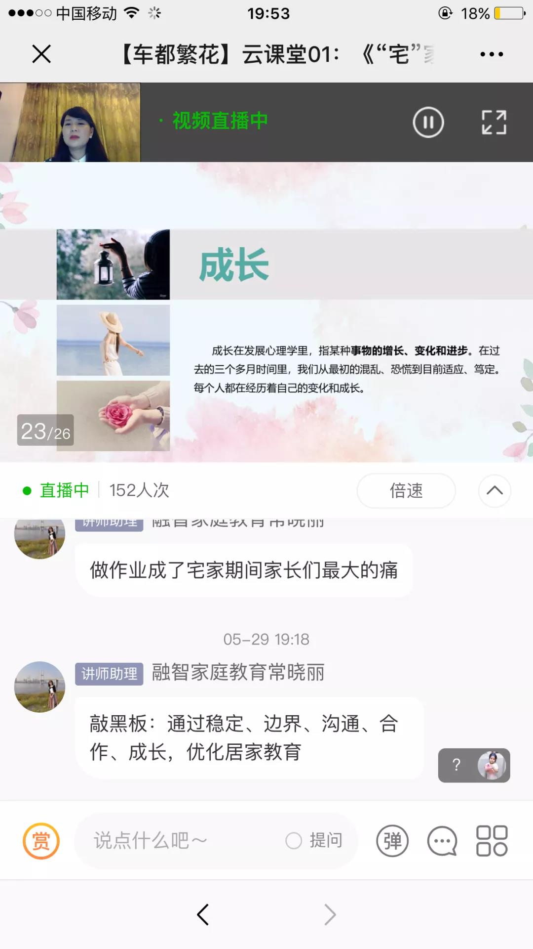 宅在家里,也能学到家庭教育的好经验、好做法。区妇联聚焦疫情期间儿童身心健康与成长发展,5月29日晚上组织开展“六一”云课堂,采取线上直播的形式,全区广大家庭与家庭教育专家实现线上“面对面”,共同探讨家庭教育焦点问题,探寻科学家庭教育方法,通过ppt展示、老师授课、在线互动等方式缓解疫情期间长时间宅家造成的心理压力、焦虑情绪,及时解决家长们宅家遇到的种种问题。