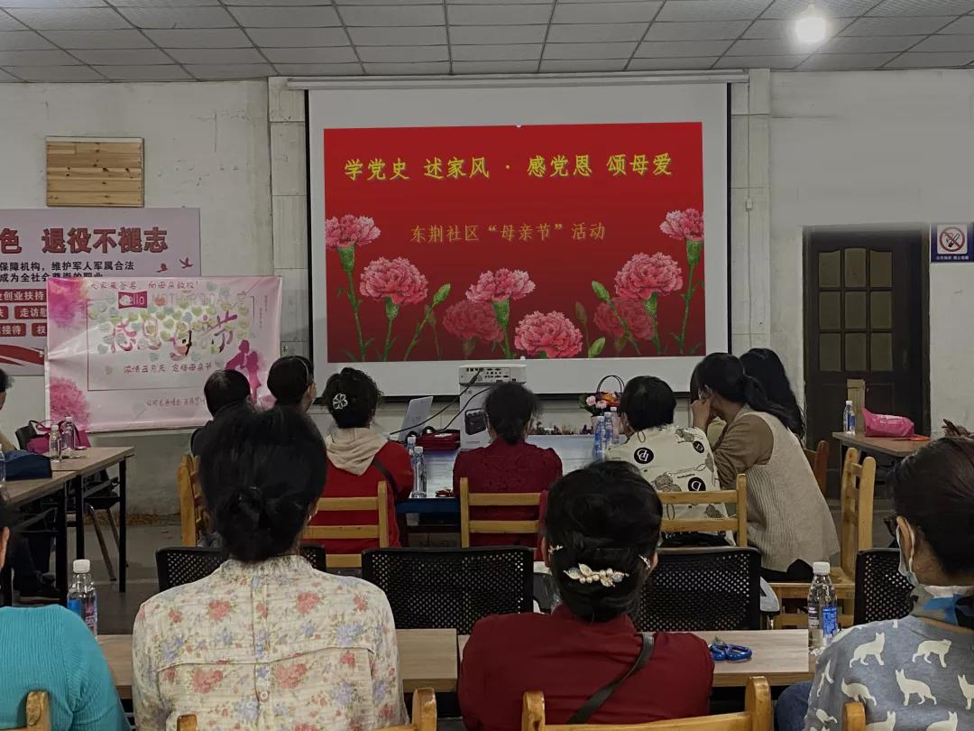 5月7日,沌口街道东荆社区举办了“学党史、述家事·感党恩、颂母爱”的视频学习党史、知识抢答、家风故事分享、“感恩母爱,礼予鲜花”母亲节主题活动。活动中社区妇联为4户区级最美家庭颁发证书。