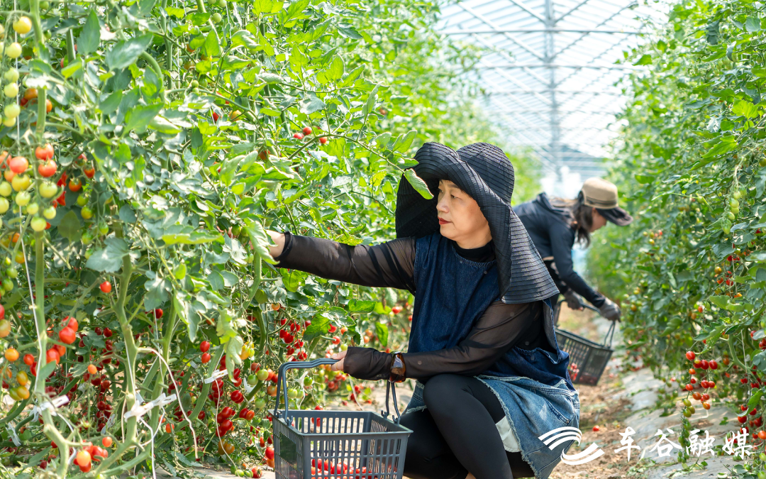 记者现场看到,近3米高的大棚里长满一人多高绿油油的藤蔓,藤蔓上一串串樱桃番茄宛如一串串葡萄,红的似小灯笼,青的如橄榄果。项目负责人刘桌明说,农园种植了“吉诺比利”等市场火热的番茄品种,这些番茄比普通番茄口感更好,既可以当水果吃,也适合做菜。