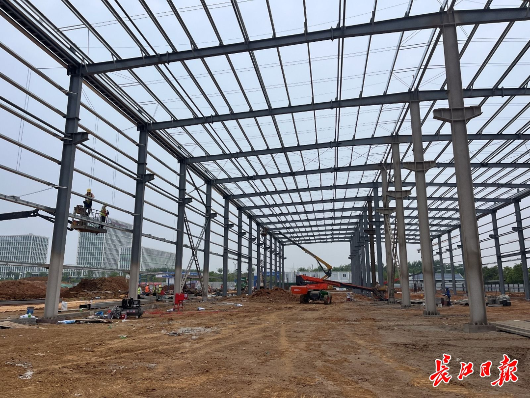 5月30日,记者穿过钢筋林立的作业区看到,四栋钢结构厂房已率先封顶,与之相邻的八栋框架结构厂房区域,工人们正在加紧进行框架搭建中。项目负责人徐刚正在现场巡查,对讲机里不时传来各作业面进度汇报。