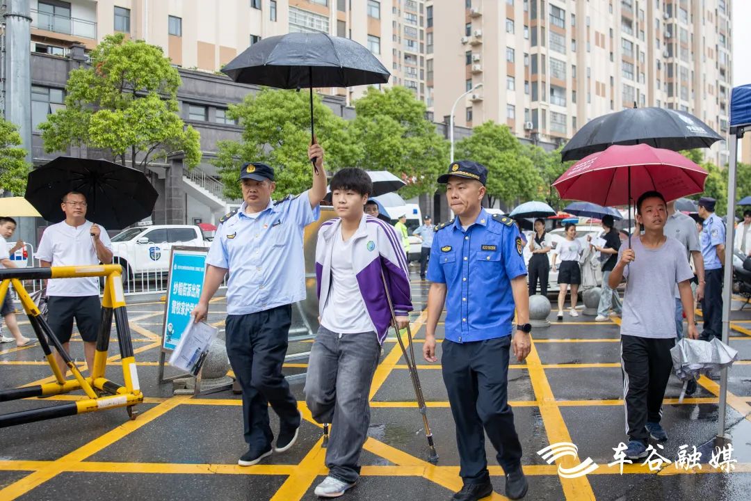 汉南一中考点外,一位腿脚受伤、拄拐的考生缓慢走向校门。纱帽街道综合执法中心队长孟祥刚和同事快步上前,一个搀扶考生、一个撑伞,将这名考生送入考场。