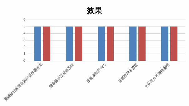 效果方面主要评价更新和安装健身器材街道覆盖率、健身徒步活动普及度、体育领域影响力、体育活动丰富度、全民健身可持续影响。对于该项的评价,评价小组主要采取了案卷研究、访谈、实地调研等方式进行资料收集、整理和分析,查看了项目实施单位2019年度总结等资料,对项目相关负责人进行访谈了解项目实施单位开展项目产生的社会效益,对项目效果涉及的指标进行打分和评价。经过综合计分,效果指标得分为25分,评价等级为优。
