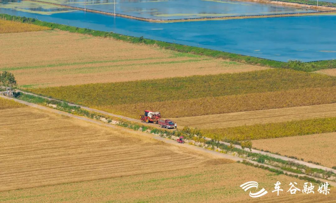 耳边传来收割机作业的隆隆声。哦,这里的大豆也正在收获。金黄,是这片土地的主色调。