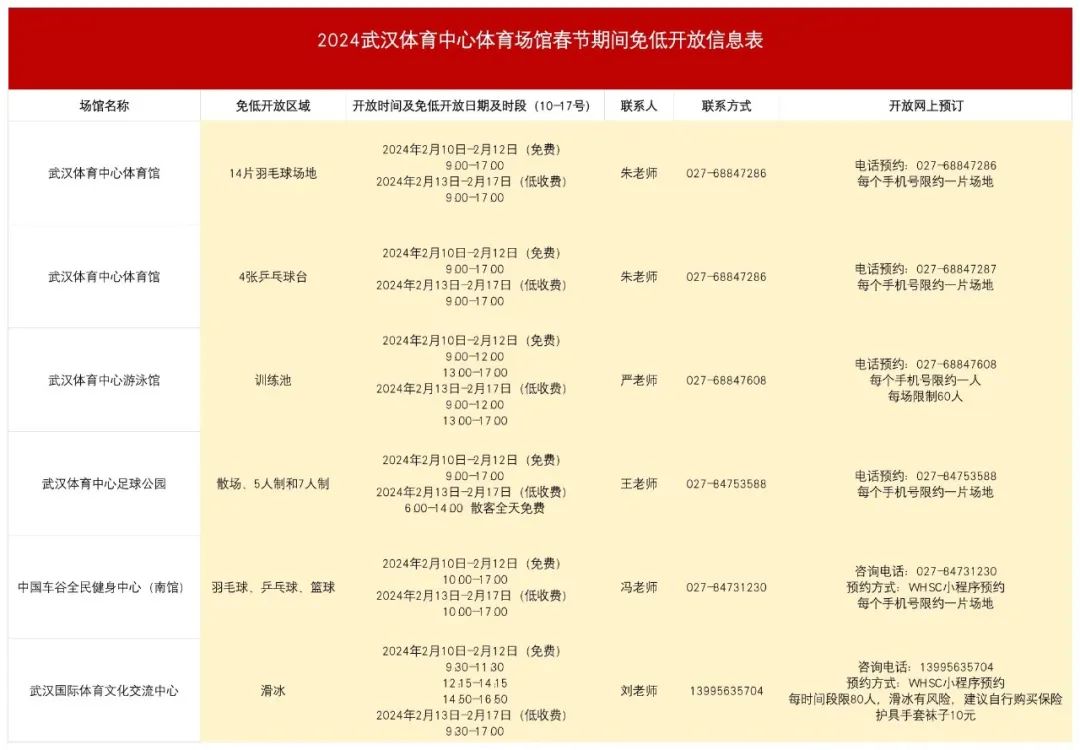 2月10日-2月17日期间,武汉体育中心场馆群、中国车谷全民健身中心(南馆),将在每日固定时间段向社会免费或低收费开放,市民可通过车谷体育公众号平台线上查询或致电各场馆进行咨询。