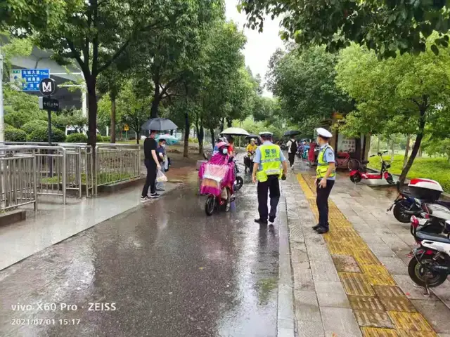 区交通大队围绕建党百年大庆安保工作,组织全警上路积极应对大雨天气对道路交通带来的不利影响。