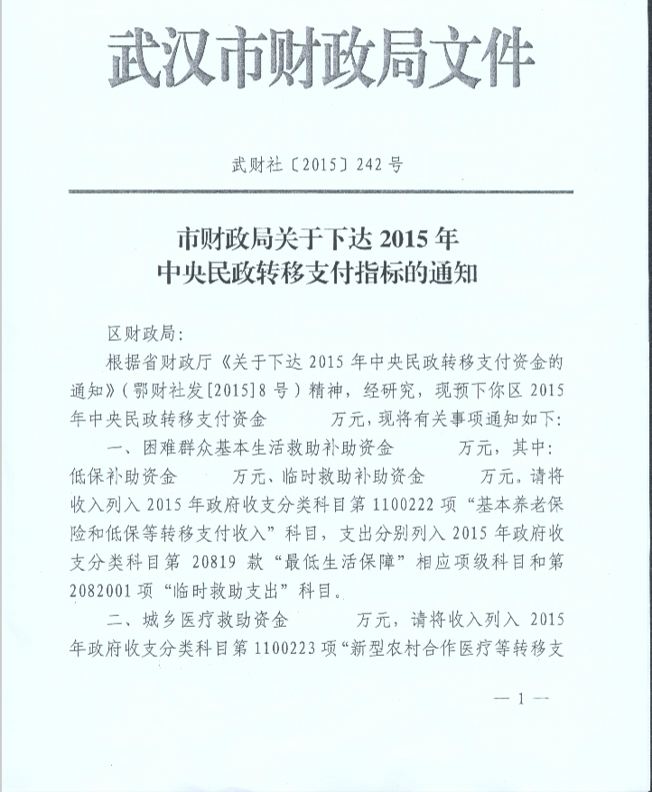 市财政局关于下达2015年中央民政转移支付指标的通知-武财社[2015]242号